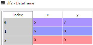 - df2 = pd.DataFrame({'x':[5,6,0],'y':[7,8,0]})