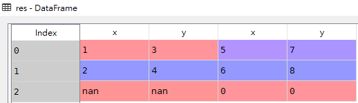 如果要将多个DataFrame按列拼接在一起,可以传入axis=1参数,这会将不同的数据追加到列的后面,索引无法对应的位置上将值填充为NaN