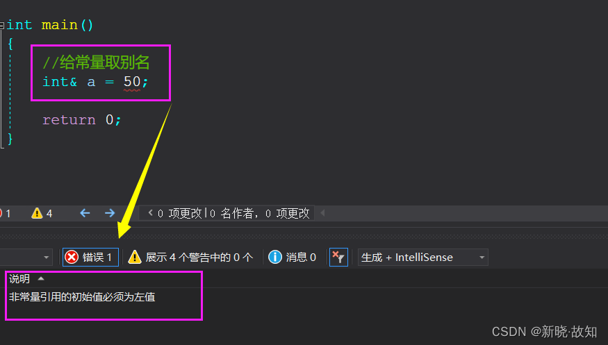 - //int& ra = a; // 该语句编译时会出错,a为常量