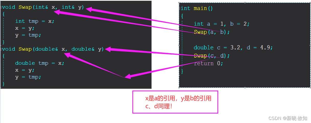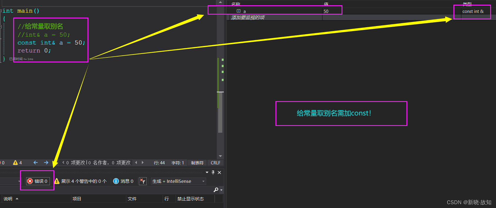 int main() { int a = 10; int& b = a; //取别名的原则:对原引用变量,权限(读写)等级只能缩小、同级,但不能放大 const int x = 20; const int& y = x; //权限等级不变 //int& y = x; //权限等级放大—>报错 int c = 30; const int& d = c; //权限等级缩小 return 0; }