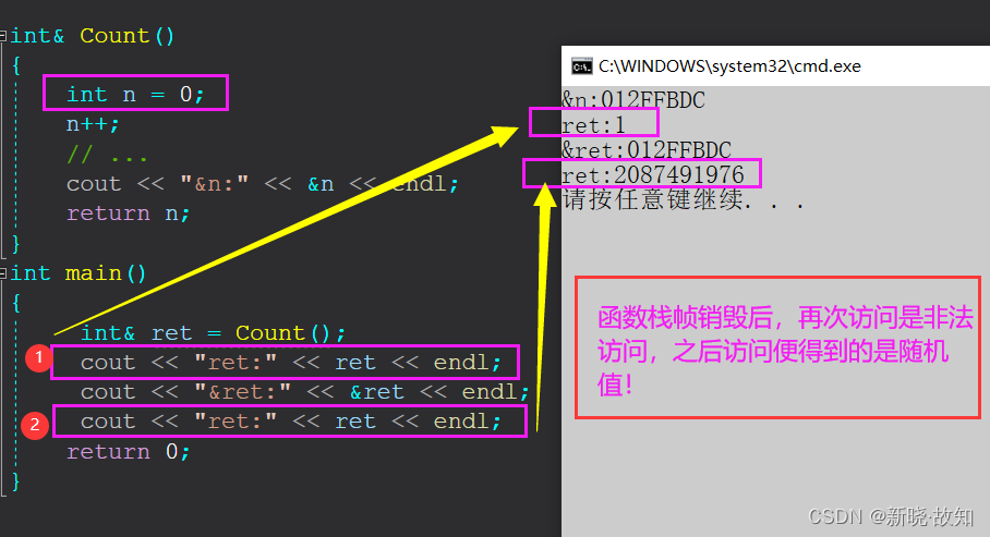 int& Add(int a, int b) { int c = a + b; return c; } int main() { int& ret = Add(1, 2); Add(3, 4); cout << "Add(1, 2) is :"<< ret <<endl; return 0; }