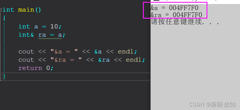 int main() { int a = 10; int& ra = a; cout<<"&a = "<<&a<<endl; cout<<"&ra = "<<&ra<<endl; return 0; }