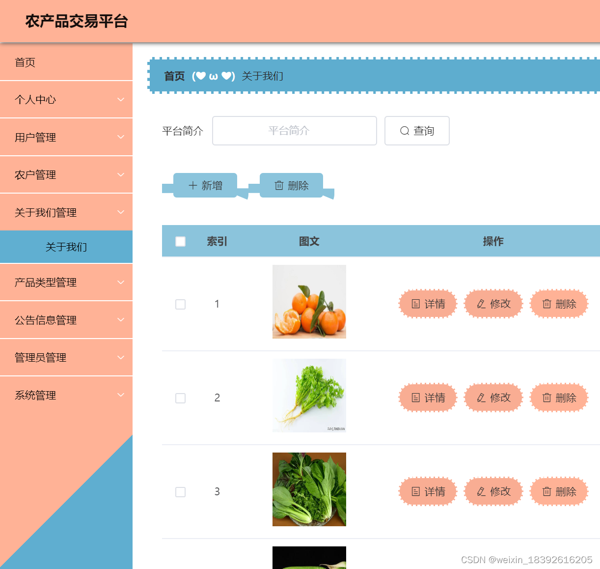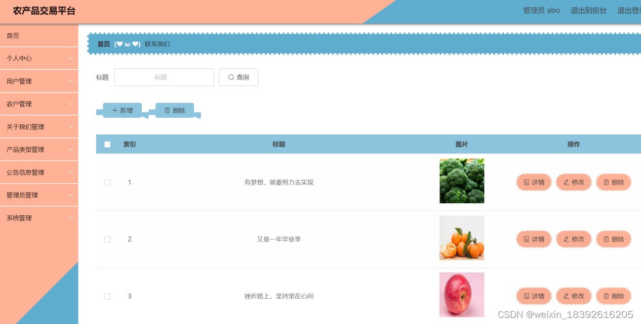 管理员:个人中心、用户管理、农户管理、关于我们管理、产品类型管理、公告信息管理、管理员管理、系统管理。