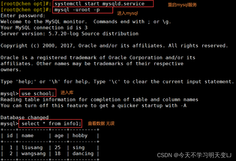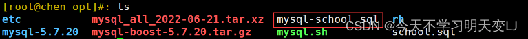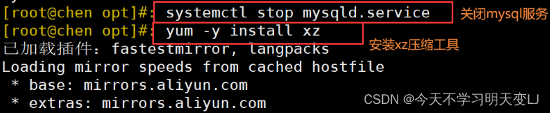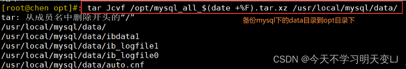 1. #关闭mysql,备份data目录 systemctl stop mysqld yum -y install xz cd /usr/local/mysql #压缩备份data目录 tar Jcvf /opt/mysql_all_$(date +%F).tar.xz data/ 2. #登录mysql,删除‘辰宝专用’库 systemctl start mysqld.service mysql -u root -p123123 3. #解压之前备份的数据库data目录,不用删除原目录,会自动替换 cd /opt ls cd /usr/local/mysql tar Jxvf /opt/mysql_all_2021-11-28.tar.xz -C ./ 4. #重启服务查看被删除的库