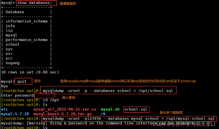 mysqldump -u root -p --databases school > /opt/school.sql