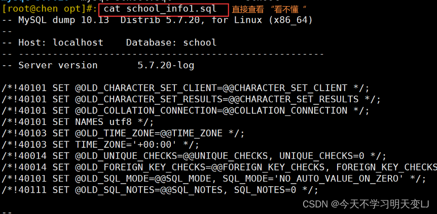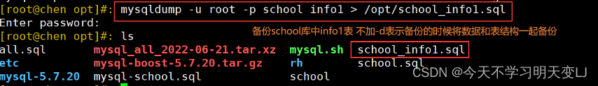 mysqldump -u root -p school info1 > /opt/school_info1_$(date +%F).sql