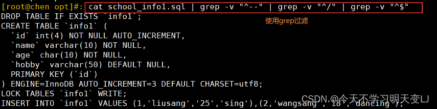 cat /opt/school_class.sql |grep -v "^--" | grep -v "^/" | grep -v "^$"