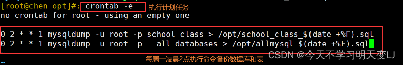 0 2 * * 1 mysqldump -u root -p school info1 > /opt/school_info1_$(date +%F).sql
