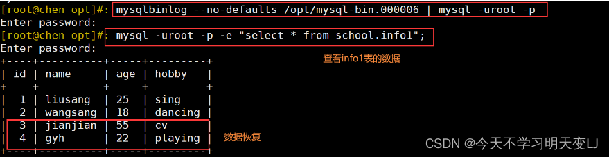 mysqlbinlog --no-defaults /opt/mysql-bin.000006 | mysql -u root -p #使用mysqlbinlog将二进制文件中的数据导入到数据库中