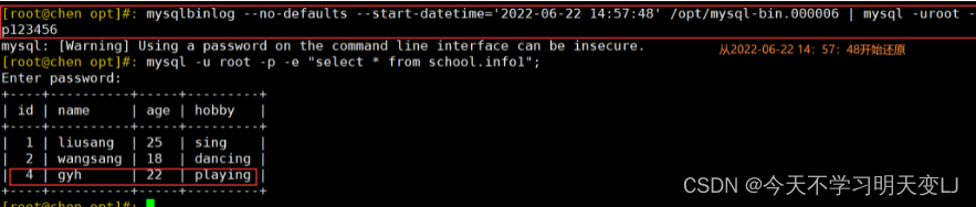 mysqlbinlog --no-defaults --start-datetime='2022-06-22 14:57:48' /opt/mysql-bin.000006 | mysql -uroot -p123456