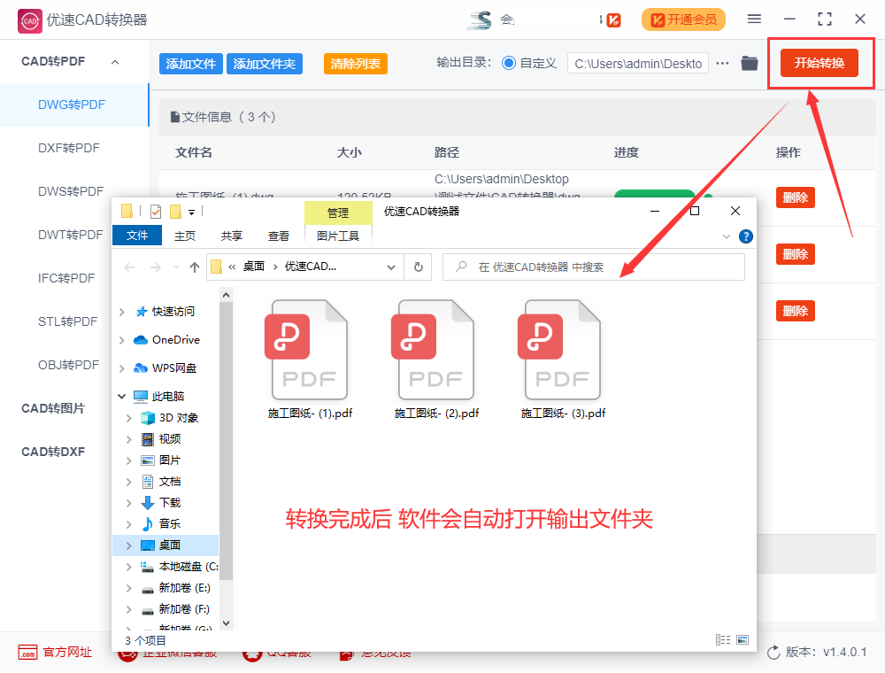 步骤3,先设置输出目录文件夹,用来保存转换后的文件;最后点击右边的红色按钮,启动格式转换,完成转换后软件会自动打开输出文件夹,方便我们查看转换成的pdf文件。