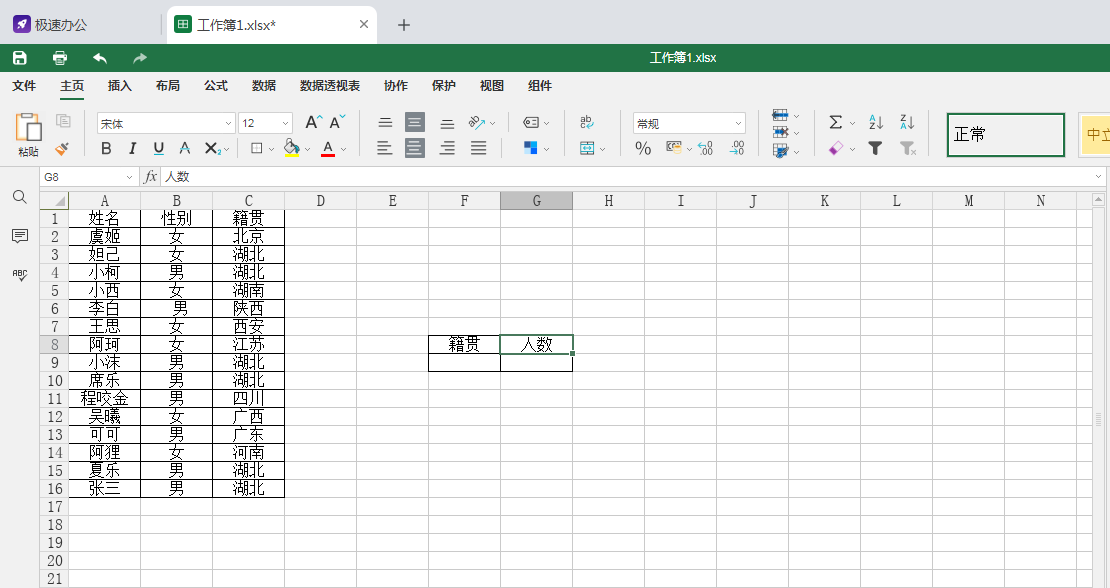 1,打开表格,输入示例内容,今天我们要统计的是:籍贯是湖北的人数。