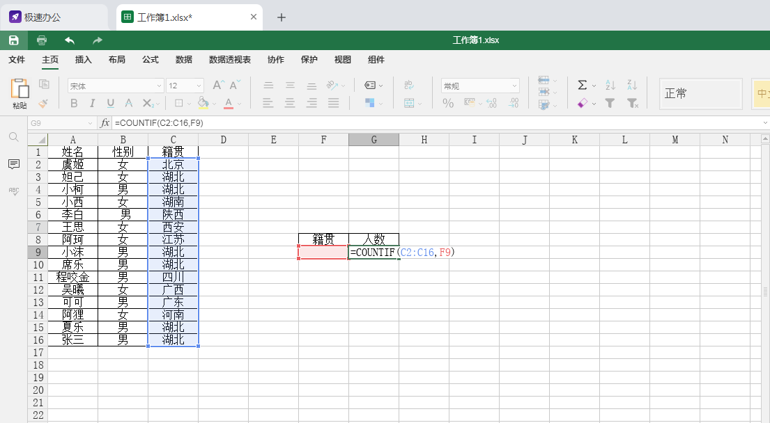 3,最后在条件内容单元格F9内输入“湖北”,这样我们就可以看到人数变成了“6”,同样输入其他条件,计数也会跟着变。
