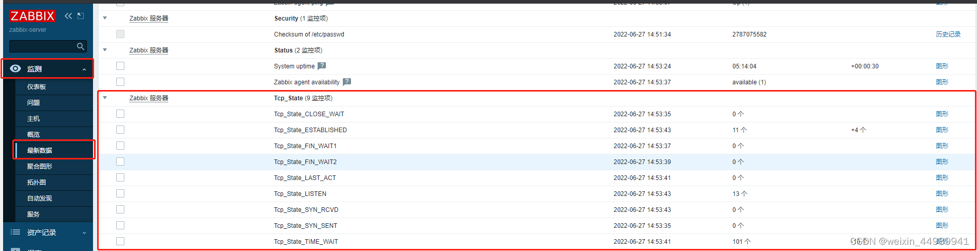 可以根据需要继续创建图形、触发器等,这里的目的是为了熟悉了解TCP连接状态,以及如何通过Zabbix来监测到数据,不做过多个性化的操作。