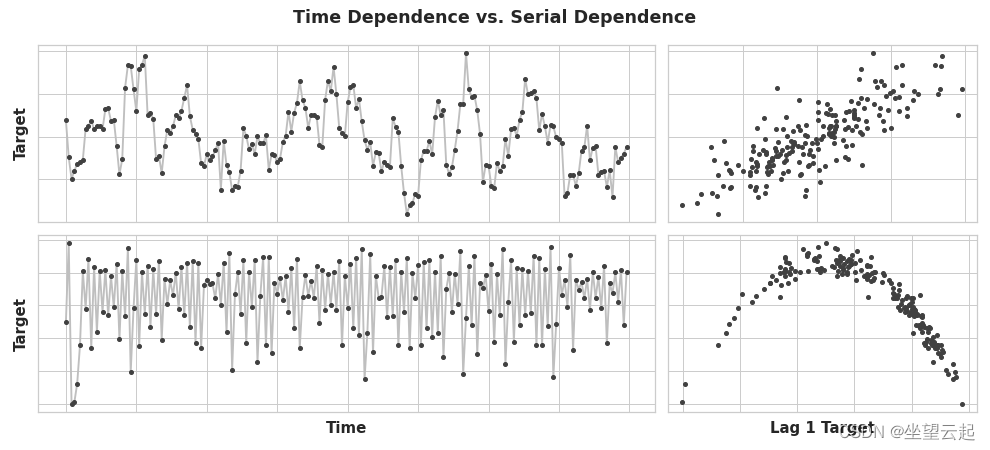最容易建模为时间相关属性的时间序列的属性,也就是说,我们可以直接从时间索引中获得特征。 但是,某些时间序列属性只能建模为序列相关属性,即使用目标序列的过去值作为特征。 随着时间的推移,这些时间序列的结构可能并不明显; 然而,根据过去的值绘制,结构变得清晰 - 如下图所示。