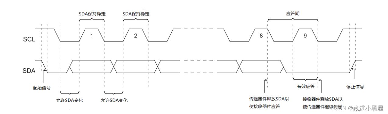 当sda、scl为低电平时,发送端开始发送数据,当接收完8bit数据会通过数据线反馈一个应答信号ACK ,应答信号低电平有效,表示已经接收到了该字节;当反馈为高电平时,表示接收该字节失败,在反馈期间 ,即接收端 在第九个时钟脉冲之前将SDA拉低,确保在该时钟周期保持低电平。另外发送多字节数据会在 有效应答后scl低电平期间继续发送数据,知道发送完所有字节数据,反馈一个NACK高电平,在scl高电平期间采样,此时表示发送数据完成,结束发送。进入停止位。
