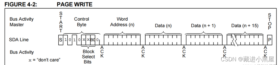 以字节为单位进行串行传输数据,每传输1bit数据都需要一个时钟周期,即20 * 250ns,在时钟线为低电平的时候进行传输数据,高电平的时候保持不变,进行采样。在时钟信号线SCL为低电平时,将需要写入的数据提前给到数据信号线SDA,方便时钟信号线SCL为高电平时,准确获取到数据信号线SDA上的数据。