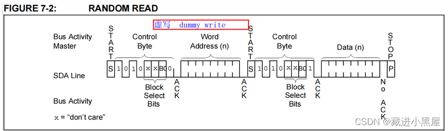 随机读,发起始位->写控制字->写读地址->接收ACK->发起始位->写读控制字->接收读数据->发NACK->发停止位。