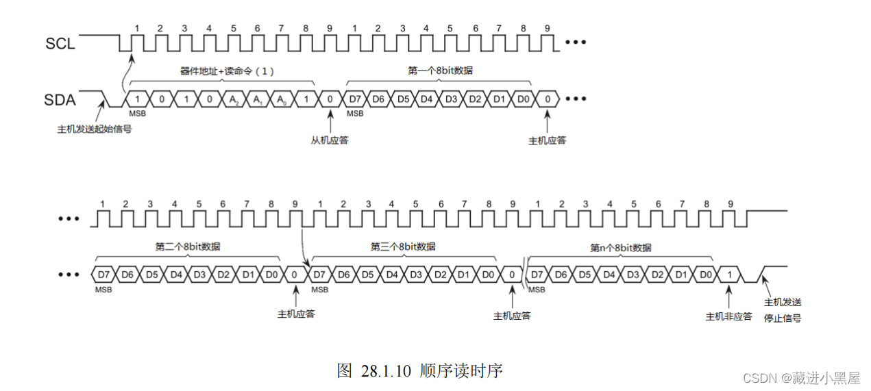 顺序读,发起始位->写控制字->写读地址->接收ACK->发起始位->写读控制字->接收读数据->发ACK->接收读数据->发NACK->发停止位。