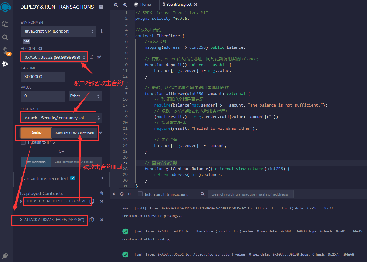 部署完成得到被攻击合约(EtherStore)地址:0xd9145CCE52D386f254917e481eB44e9943F39138