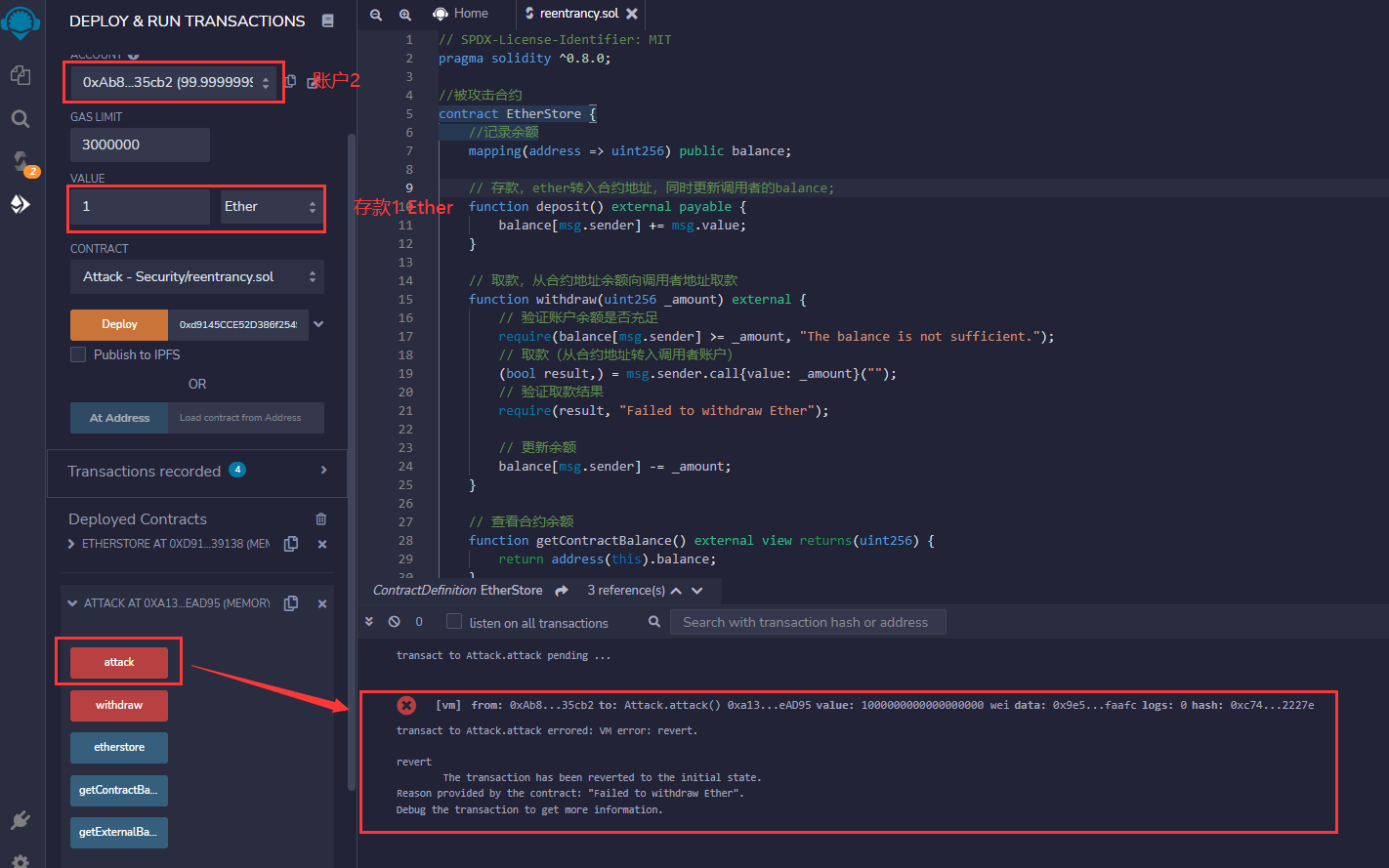 账户1 0x5B38Da6a701c568545dCfcB03FcB875f56beddC4 部署被攻击合约(EtherStore)
