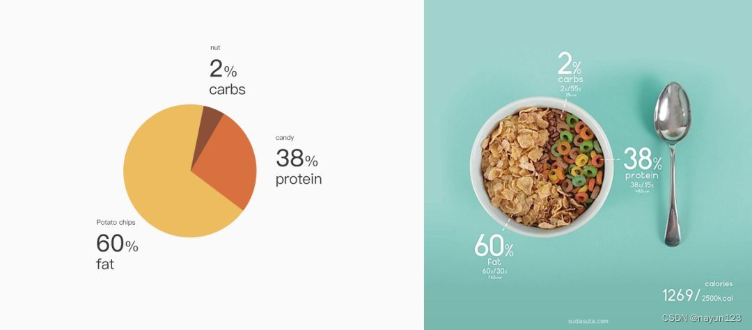 举个例子,同样是用饼图去展示膳食营养结构,下面两张图表您会选择哪个?不出意外的话肯定是右边那个吧。