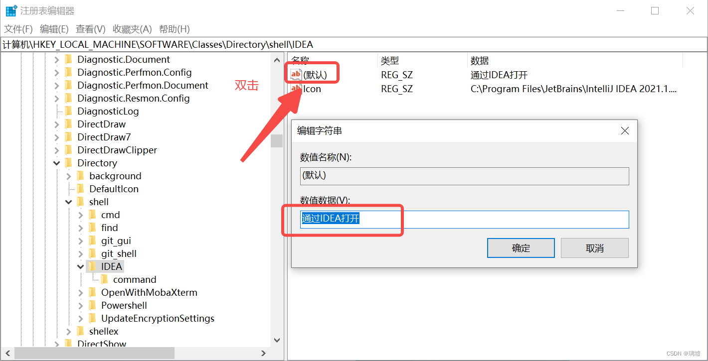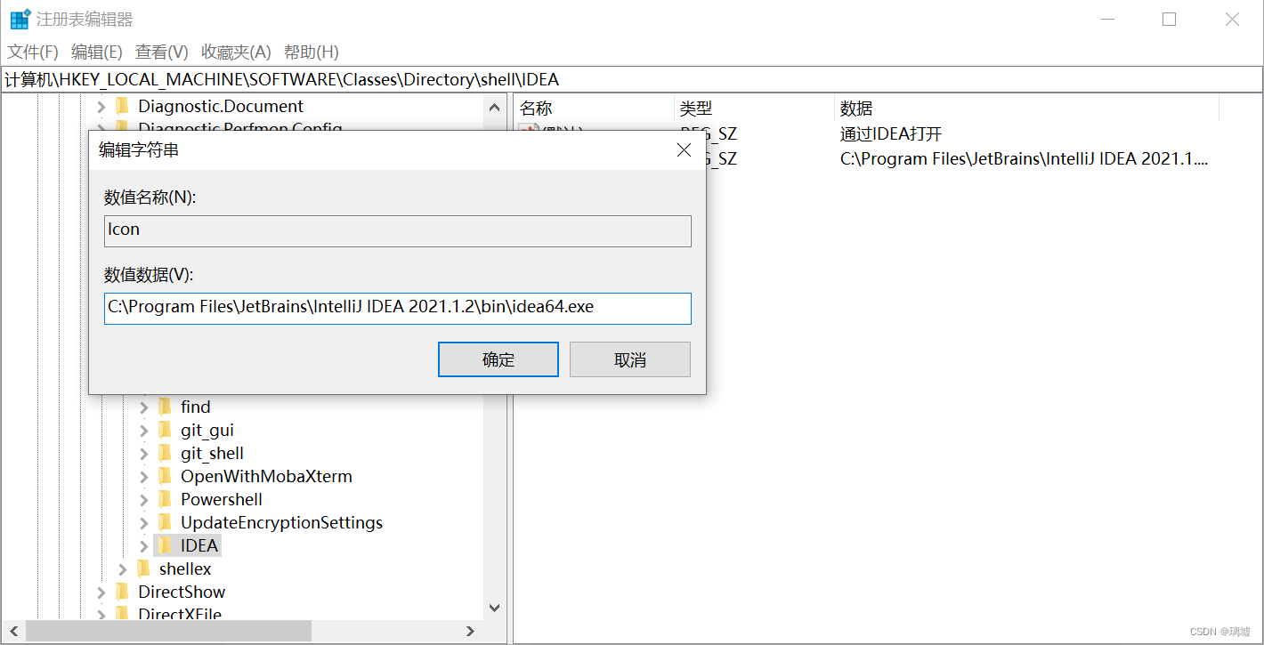 3. 在IDEA里,新建字符串值,起名Icon,数值数据为你的idea路径: