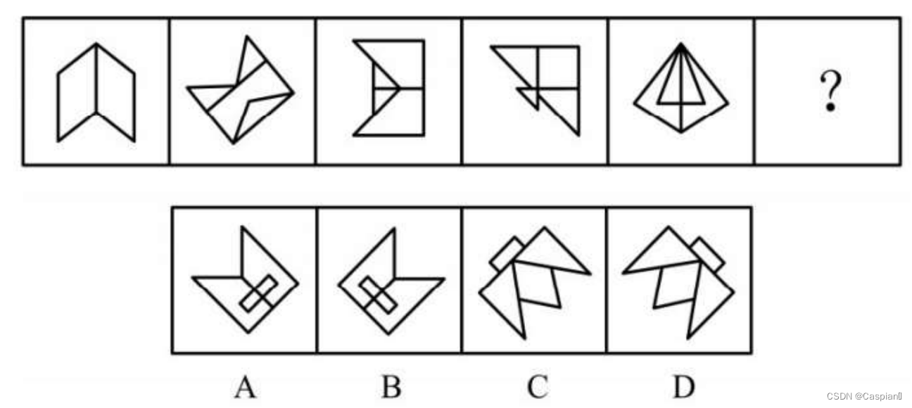 观察每个图形对称轴的方向,由对称轴的方向规律可以排除AC。再观察从第一个图形开始,对称轴与原图像的一条边重合、垂直、重合、垂直、重合,故选择无重合的B。