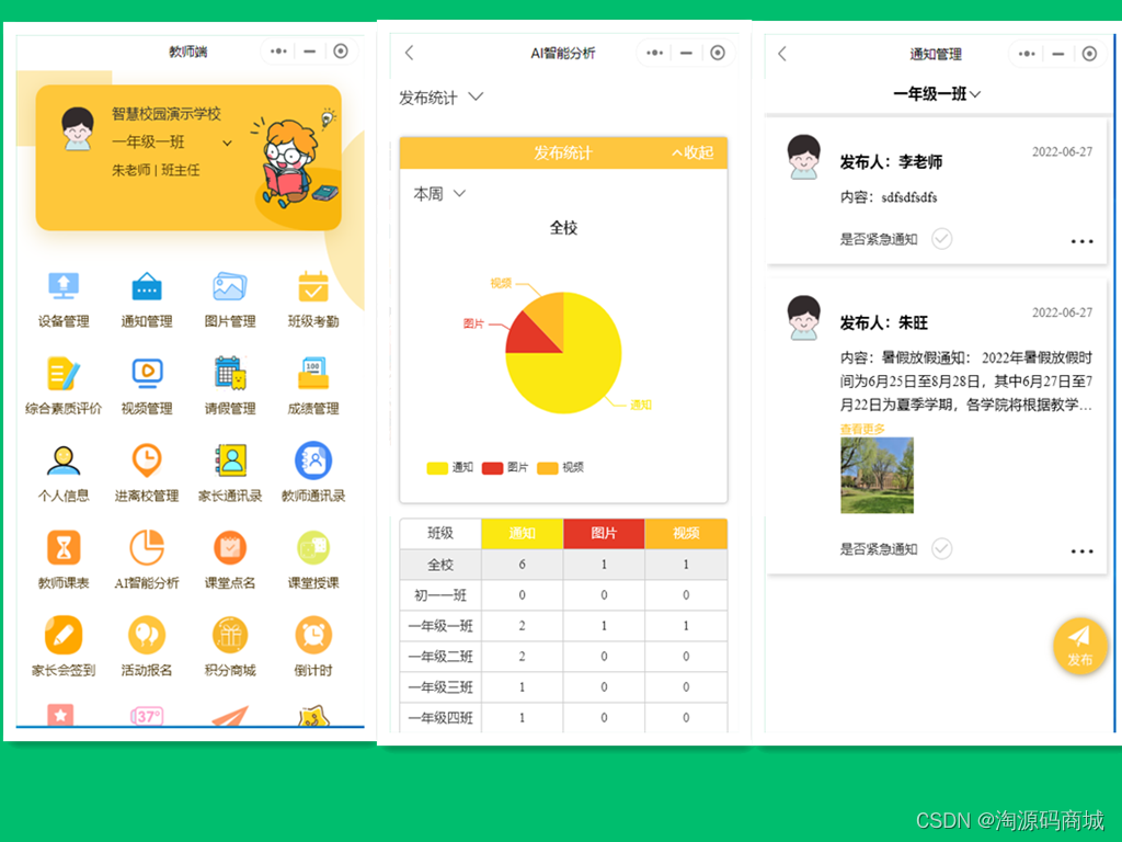 支持管理员/班主任/任课老师等角色在后台管理平台和小程序发布通知,通知内容包含:文字、图片,文件,网页链接;支持自定义配置发送班牌和家长端小程序。