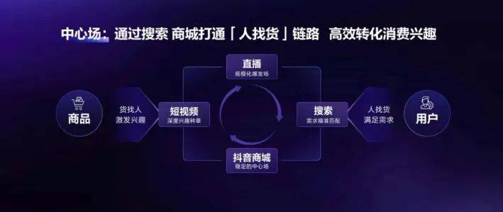 于是在最近的生态大会上,抖音电商宣布从兴趣电商升级为“全域兴趣电商”。核心的一处升级,就是抖音电商里现在有“货找人”的内容场(短视频、直播),也有“人找货”的中心场(商城、搜索),并且二者之间的双向消费链路被打通。