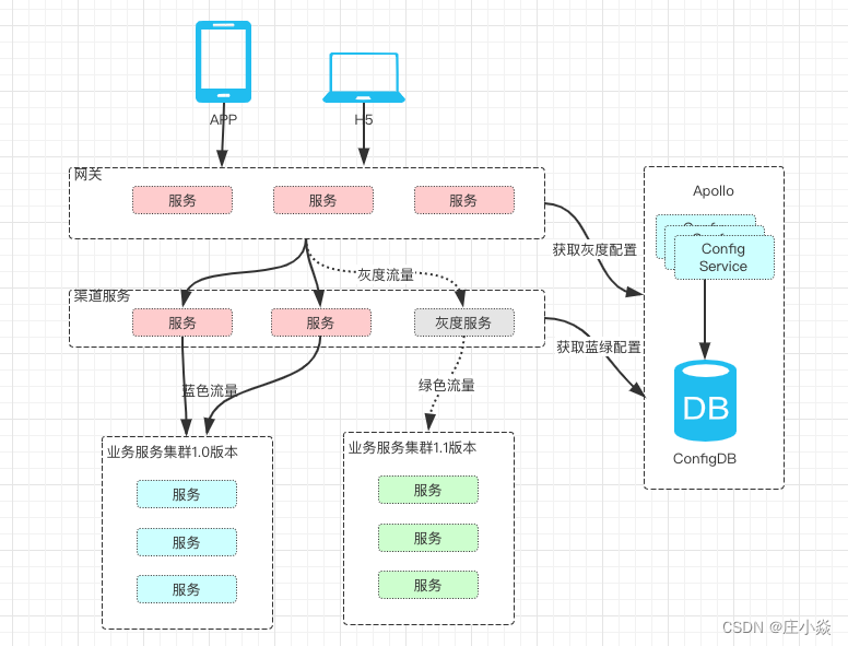 灰度发布(又名金丝雀发布)是指在黑与白之间,能够平滑过渡的一种发布方式。AB test就是一种灰度发布方式,让一部用户继续用A,一部分用户开始用B,如果用户对B没有什么反对意见,那么逐步扩大范围,把所有用户都迁移到B上面来。灰度发布可以保证整体系统的稳定,在初始灰度的时候就可以发现、调整问题,以保证其影响度。 基于微服务的多版本管理机制 灰度路由策略,即可实现基于业务规则的灰度发布。