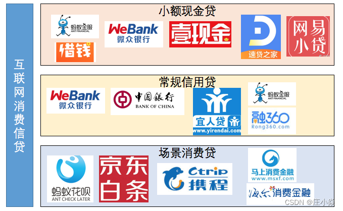 互联网消费信贷常见模式有:小额现金贷、常规信用贷、场景消费贷三大类: