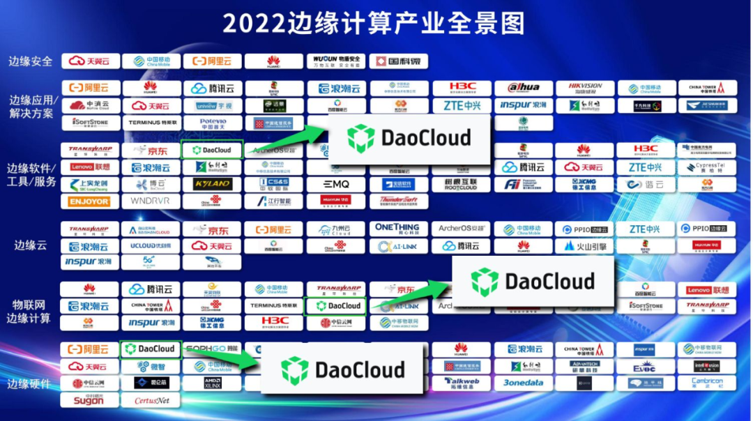 2022 年 6 月 14 日,中国信息通信研究院联合中国通信标准化协会,线上召开 “2022 云边协同大会”,重磅发布了国内首个 《2022 边缘计算产业全景图》。「DaoCloud 道客」基于云原生构建边云协同体系,将云原生的优势能力成功延伸到了边缘端,加强了「云-边-端」的协同,入选《2022 边缘计算产业全景图》多个象限。