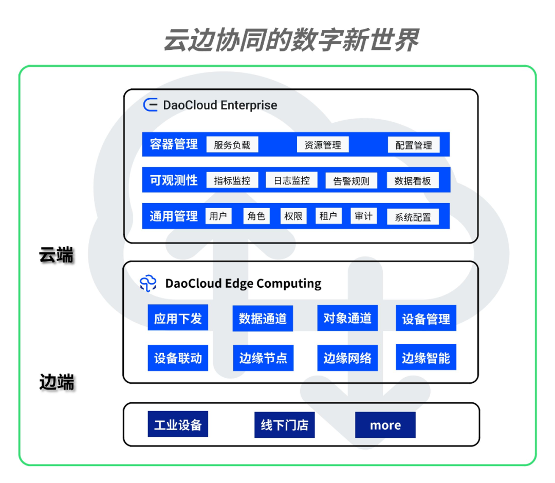 「DaoCloud 道客」作为云原生领域的创新领导者,推出的「边缘云原生平台 DaoCloud Edge Computing (DEC)」依托云原生数字底座,将企业级数字化基础设施下沉至生产活动现场,加强「云-边-端」的联系,消除技术栈的不一致性,让云边高效协同起来。