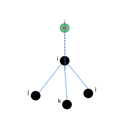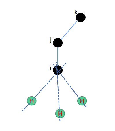 还是sp3杂化的碳原子,但是此时该碳原子已经跟其他三个重原子成键,因此有一个多余的键可以跟氢原子结合生成氢键。由于sp3杂化的特殊性,形成的结构会是一个接近于正四面体的形状。此时同样为了保持接口一致,我们选取包含sp3碳原子在内的一共3个原子,来定位氢原子的位置。