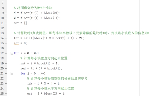 如果只把信息保存在一个像素中很容易丢失,所以根据信息长度与载体图片的长度划分小块,以一个小块存储一位信息,能大大增加信息隐藏的健壮性。