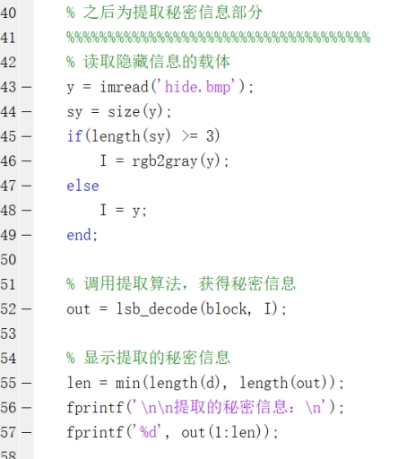 使用MATLAB实现LSB算法,用lsb_decode函数实现秘密信息嵌入,用lsb_encode函数实现秘密信息提取,之后img_lsb.m主程序对这两个函数进行调用测试,最后对提取信息进行误码率检测。