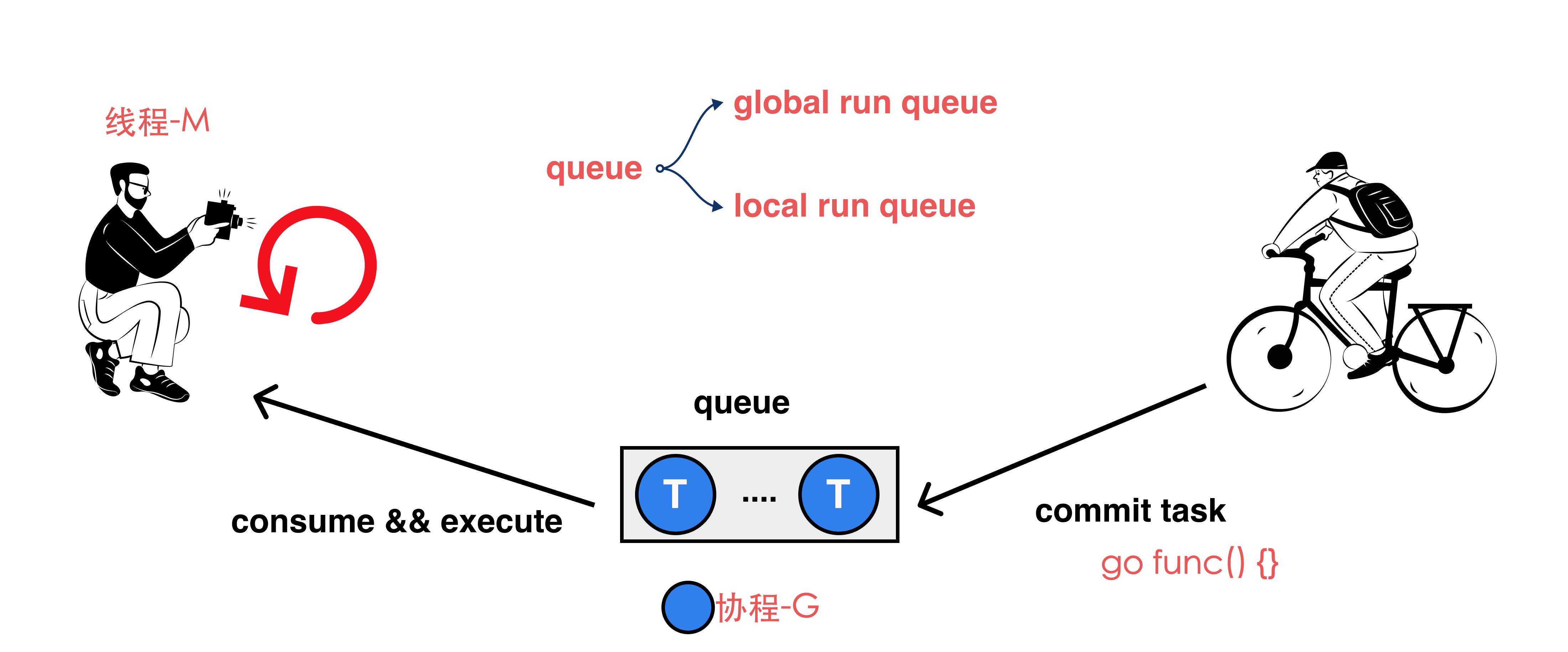 如上图所示,当我写一个go func的时候就好像我们在往队列里添加了一条数据