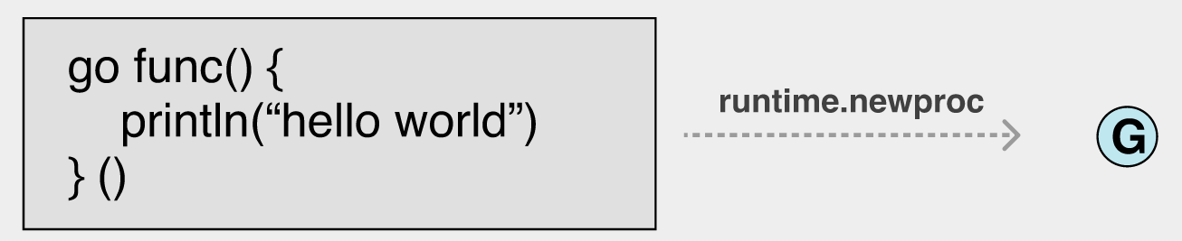 上述代码go func表示会生成一个G,这个G是通过runtime.newproc[1]生成的
