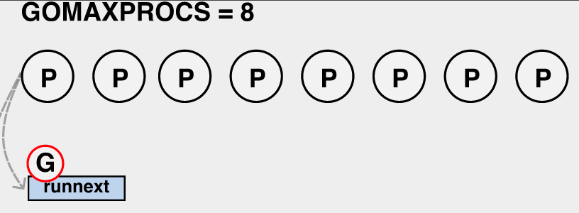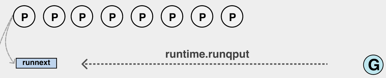 上述表示go程序执行runtime.runqput函数把G放进runnext中