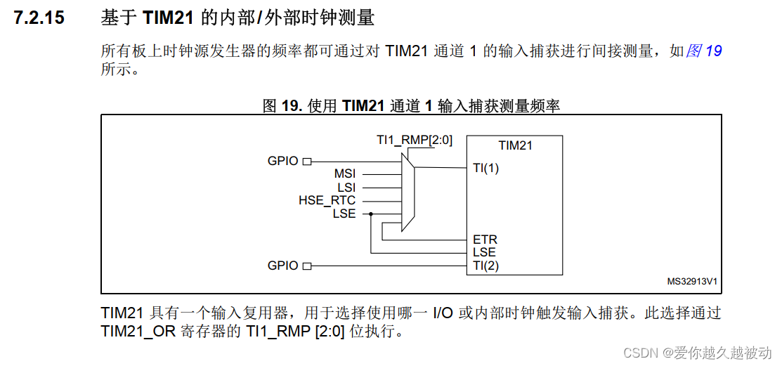 以上为数据手册介绍的方法,本文使用4096Hz的标准信号,通过GPIO引脚输入TIM21_CH1中,内部TIM21会有输入4分频,因此TIM21需要测量的周期应为(1/1024Hz) ,使用HSI的16MHz主时钟进行测量,得到的理论精确数值应为16MHz*(1/1024Hz)=15625。