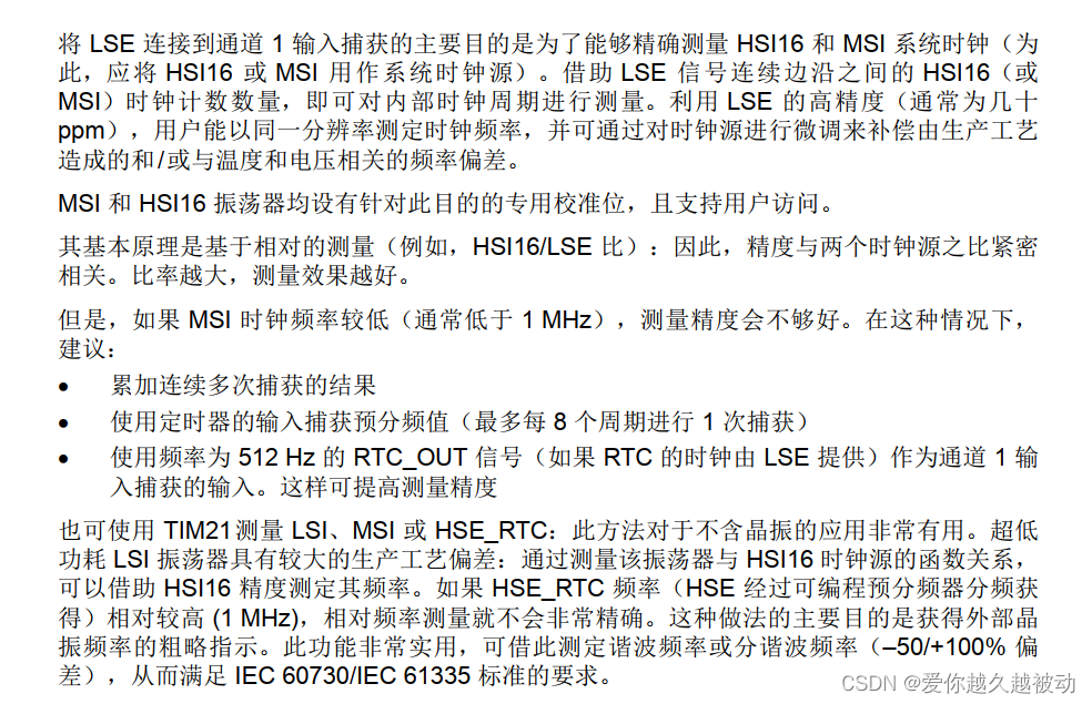 在有些应用中,无法使用外部晶振来获取准确的时钟,不得已使用STM32内部的RC时钟。HSI以及MSI等。虽然这些时钟在出厂时,已经进行了校准。但是随着环境温度变化,RC时钟会有所改变,这在对时钟敏感的场合下,是不可接受的。幸好STM32提供了一个再校准的机会。利用外部精准时钟信号,对内部时钟进行校准。