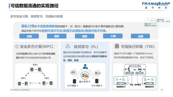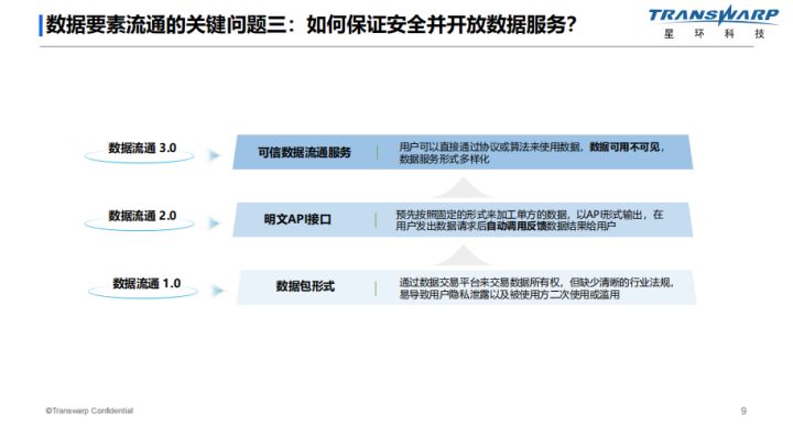 第三,如何保证安全并开放数据服务。这其实经历了从数据流通1.0-数据包形式到数据流通2.0-明文API接口,再到数据流通3.0-可信数据流通服务的演进。在可信数据流通的实现过程中,隐私计算起到了至关重要的作用。