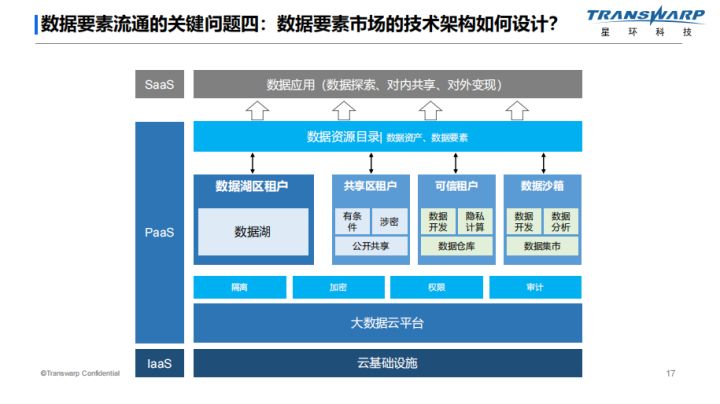 第四,数据要素市场的技术架构如何设计。首先基于基础设施会有基础层的加固;大数据云平台会有平台层的加固,包括隔离、加密、权限、审计等。在这之中,由于很多企业对系统架构有不同的需求,会开几个独立的环境,比如共享区里面会有公开数据,是大家可以去使用的一些低敏感数据。而在可信环境,某些数据是比较敏感的,不能直接使用,就会有很多隐私计算的应用。最后是数据沙箱的环境,更多是做存算分离,对数据资源本身进行保护,达到数据的可用不可见。
