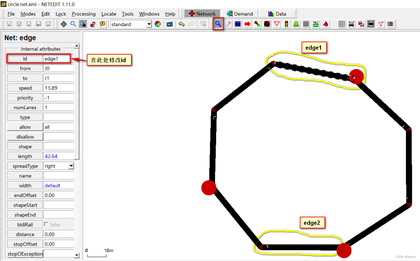 2. 从圆环中随机选两条边,作为车辆行驶的起点和终点。在Inspect模式下选中两条边,并修改其id为"edge1"和"edge2"
