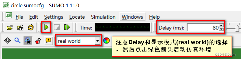 3. 用sumo-gui.exe打开circle.sumocfg文件,启动仿真环境