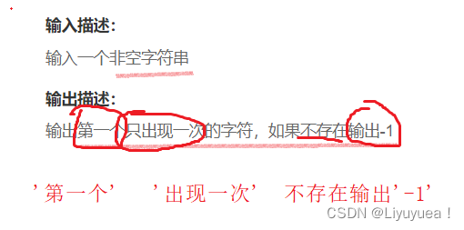 - 出现的字符有多个只出现了一次,但是输出首个(第一次)出现的字符。