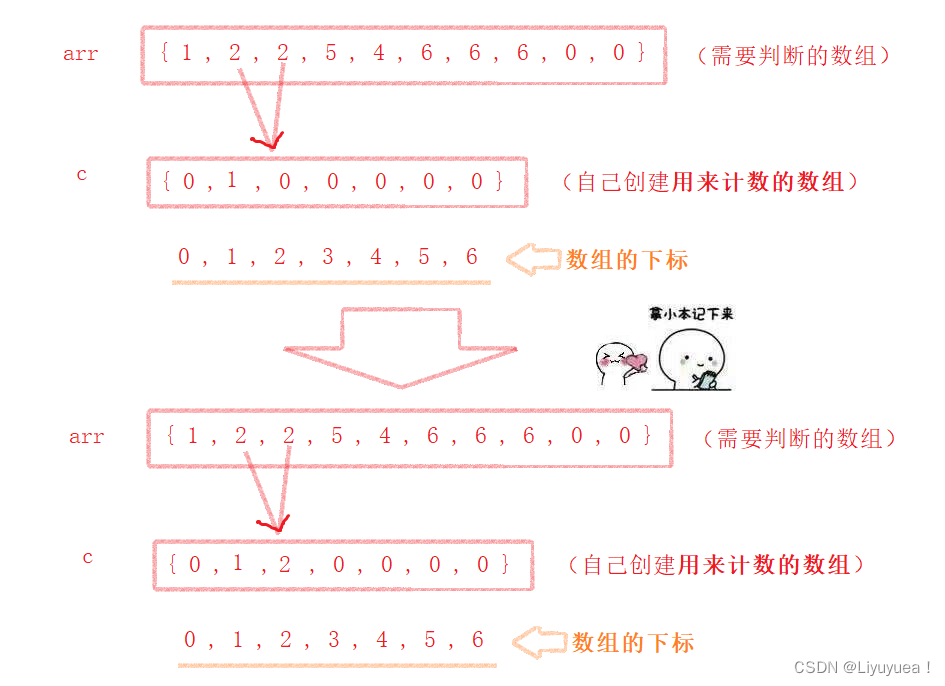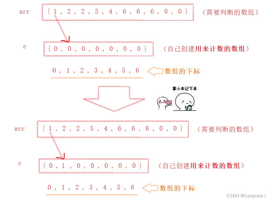 按照上面的方法依次记录,最后得到的数组就是arr里 从0到6,每个数出现了几次,再根据最开始讲的那三种情况进行分析。