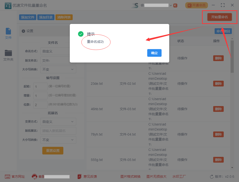步骤4,点击软件右上角的【开始重命名】按钮启动软件,稍微等待一小会,文件名修改完成后软件会弹出“重命名成功”的提示。
