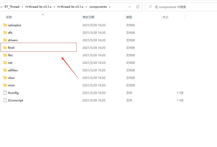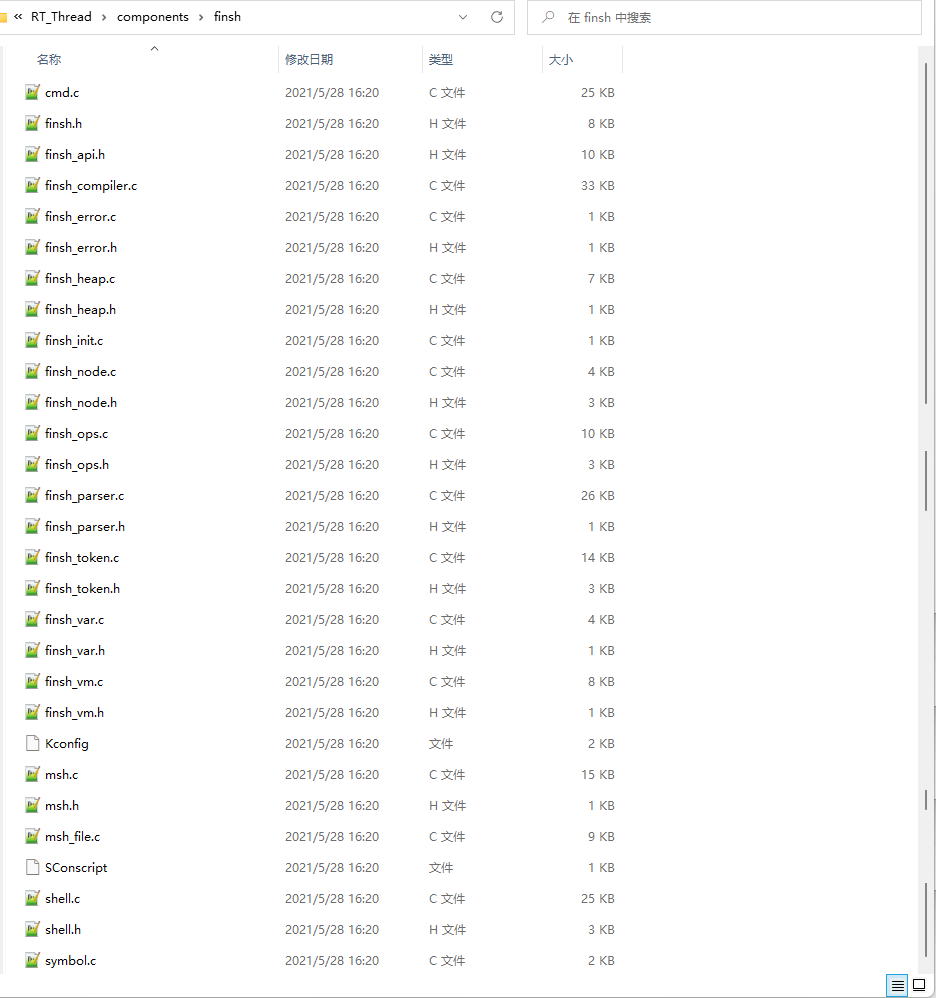 FinSH 源码位于 components/finsh 目录下,如下图所示: